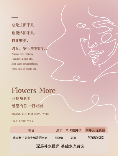 门店装饰升级:将美容院门店进行全面的周年庆主题装饰,悬挂横幅、张贴美容院周年庆海报、摆放鲜花等,营造浓厚的节日氛围,吸引过往行人的注意。