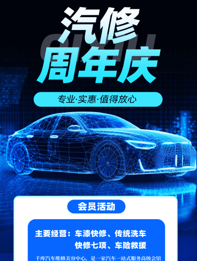 在汽车修理行业,汽修店开业初期知名度低、客户信任度不足,周年庆时又面临如何唤醒老客户、吸引新客源的难题。传统促销活动形式单一,难以在众多竞争对手中脱颖而出,无法有效提升品牌影响力和市场占有率。 添加设计师微信
