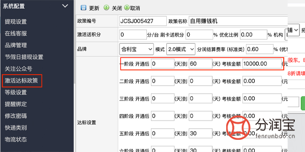 例:激活达标政策里面,对应的达标设置第一阶段1-30天,考核金额为10000元。若1-30天,未刷满10000元。