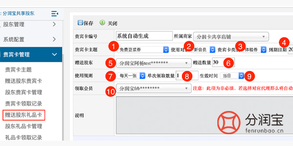 6、赠送股东礼品卡:①选择贵宾卡主题;②选择使用对象;③选择贵宾卡类型; ④选择到期时间; ⑤选择赠送股东;⑥填写赠送数量; ⑦选填使用规则(每天一张);⑧填写单次领取数量;⑨选填生效时间(当天);⑩选择领取会员