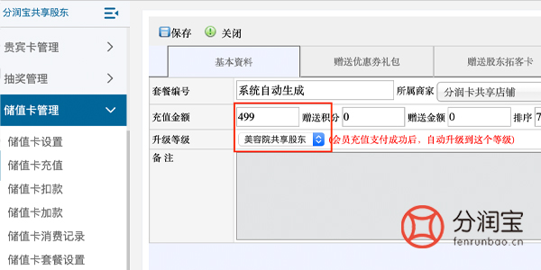 2、储值卡管理-->点击添加-->>填写充值金额-->>选择升级等级-->>点击保存