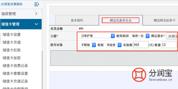 3、赠送优惠券礼包(需先在贵宾卡主题内设置)-->选择主题-->>选择使用规则-->>选择绑定股东-->>选择使用对象-->>填写有效期-->>填写数量-->>点击添加