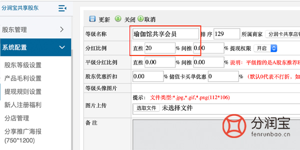 -->>填写等级名称-->>填写分红比例-->>点击更新