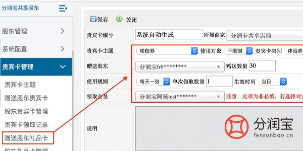 3、赠送股东礼品卡:①选择贵宾卡主题(需在贵宾卡主题内设置);②选择使用对象;③选择贵宾卡类型; ④选择到期时间; ⑤选择赠送股东;⑥填写赠送数量; ⑦选填使用规则(每天一张);⑧填写单次领取数量;⑨选填生效时间(当天);⑩选择领取会员