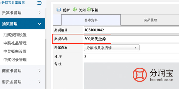 1、抽奖管理-->>中奖礼品管理-->>点击添加-->>填写奖项名称-->>点击更新