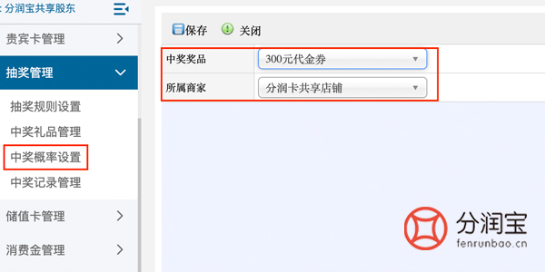 2、中奖概率设置-->>选择中奖奖品-->>点击保存
