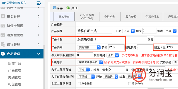 -->>填写"产品名称"-->>选填"产品类别"(如果选择不了需在产品管理>类别管理添加)-->>填写"价格"-->>选填"升级等级"-->>点击"更新"