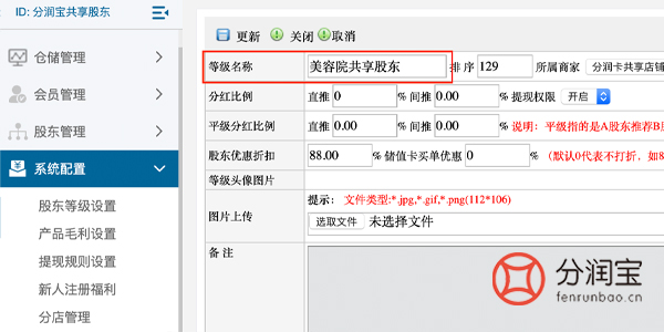 -->>填写"等级名称"-->>填写"分红比例"-->>点击"更新"