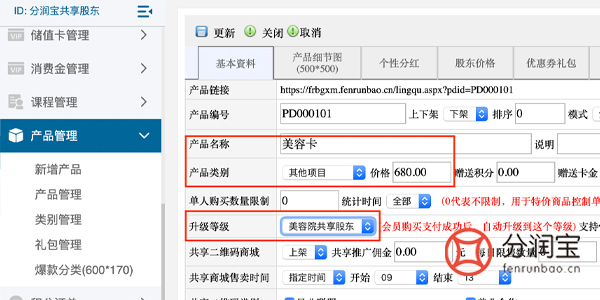 -->>填写"产品名称"-->>选填"产品类别"(如果选择不了需在产品管理>类别管理添加)-->>填写"价格"-->>选填"升级等级"-->>点击"更新"