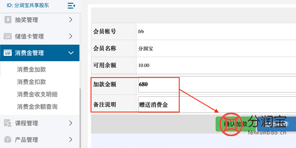 -->>填写"加款金额"-->>填写"备注说明"-->>点击"确认加款"