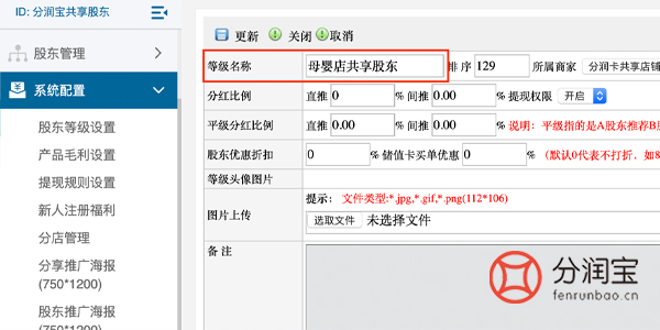 1、登录共享股东软件-->>股东等级设置-->>点击"添加"-->>填写"等级名称"-->>点击"更新"