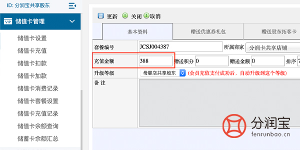2、储值卡管理-->点击“添加”-->>填写“充值金额”-->>选择“升级等级”-->>点击“更新”