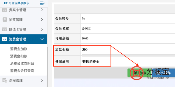 2、消费金管理-->>填写“会员/股东手机账号或姓名全称”-->>点击“加款 下一步”