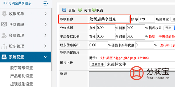 -->>填写"等级名称"-->>填写"分红比例"-->>点击"更新"