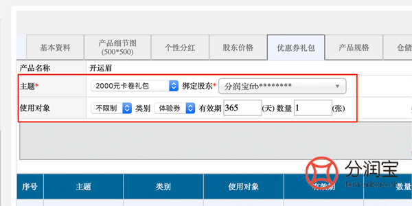 3、赠送优惠券礼包(需先在贵宾卡主题内设置)-->选择"主题"-->>选择"使用规则"-->>选择"绑定股东"-->>选择"使用对象"-->>填写"有效期"-->>填写"数量"-->>点击"添加"