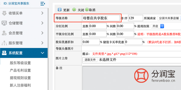 1、登录共享股东软件-->>股东等级设置-->>点击"添加"-->>填写"等级名称"-->>点击"更新"