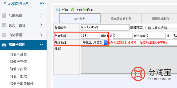 2、储值卡管理-->点击“添加”-->>填写“充值金额”-->>选择“升级等级”-->>点击“更新”