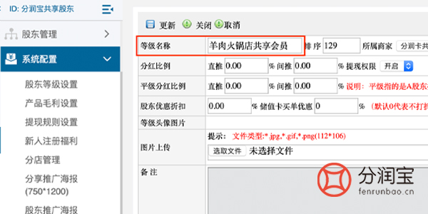 1、登录共享股东软件-->>股东等级设置-->>点击"添加"-->>填写"等级名称"-->>点击"更新"