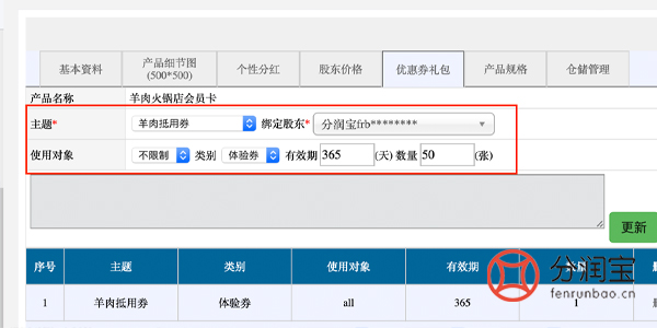 3、赠送优惠券礼包(需先在贵宾卡主题内设置)-->选择"主题"-->>选择"使用规则"-->>选择"绑定股东"-->>选择"使用对象"-->>填写"有效期"-->>填写"数量"-->>点击"添加"