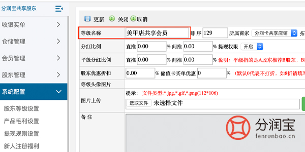 1、登录共享股东软件-->>股东等级设置-->>点击"添加"-->>填写"等级名称"-->>点击"更新"