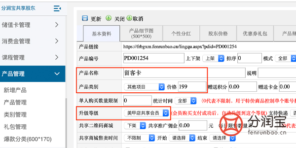 -->>填写"产品名称"-->>选填"产品类别"(如果选择不了需在产品管理>类别管理添加)-->>填写"价格"-->>选填"升级等级"-->>点击"更新"