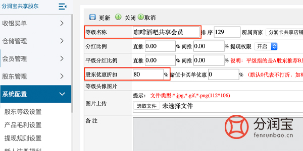 1、登录共享股东软件-->>股东等级设置-->>点击"添加"-->>填写"等级名称"-->>填写"股东优惠折扣"-->>点击"更新"