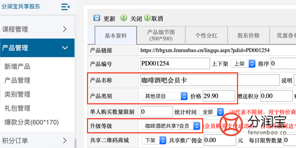 -->>填写"产品名称"-->>选填"产品类别"(如果选择不了需在产品管理>类别管理添加)-->>填写"价格"-->>选填"升级等级"-->>点击"更新"