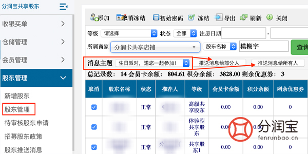 3、股东管理-->>选择"消息主题"(在股东消息推送内添加需要推送的内容)-->>单个选择股东/单个选择会员-->>推送消息给所有人/推送消息给部分人