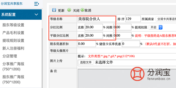 ②填写“等级名称”-->>填写“分红比例”-->>填写“平级分红比例”-->>更新