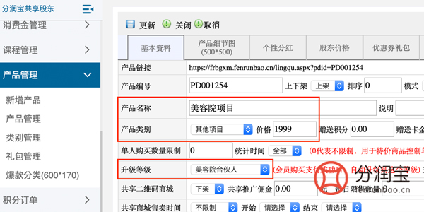 ③产品管理-->>新增产品-->>填写“产品名称”-->>填写“说明”-->>选填“产品类别”(类别管理内添加)-->>填写“价格”-->>填写“赠送积分”-->>填写“赠送卡金”-->>填写“销量”-->>填写“单人购买数量限制”-->>选择“统计时间”-->>选填“升级等级”(在股东等级设置内填写等级名称)