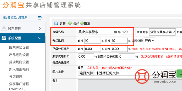 ①系统配置>股东等级设置>添加>填写“等级名称”>填写“直推/间推 分红比例”>更新