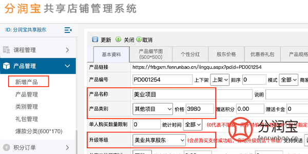 ②产品管理>填写“产品名称”>填写“产品类别”(在类别管理中添加类别)>填写“价格”>选填“升级等级”>更新