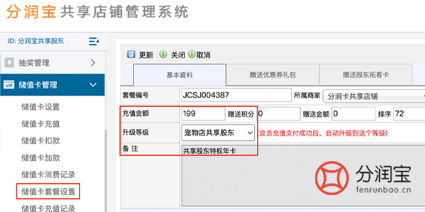 2、储值卡管理--储值卡套餐设置--填写“储值金额”(199元)--选择“升级等级”(宠物店共享股东)--备注(共享股东特权年卡)
