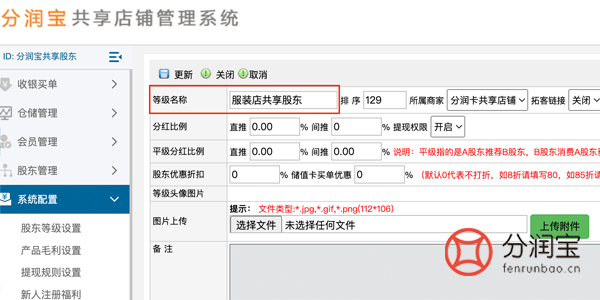 系统配置>股东等级设置>添加>填写“等级名称”>填写“分红比例”>填写“平级分红比例”>填写“股东优惠折扣”>更新