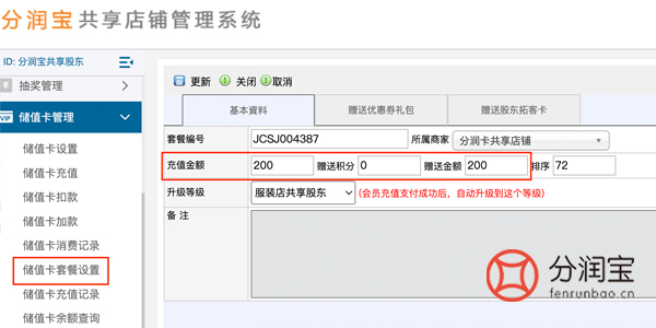 填写“充值金额”(若有赠送积分/赠送金额,按实际情况填写)> 填写“赠送金额”>选择“升级等级”>更新