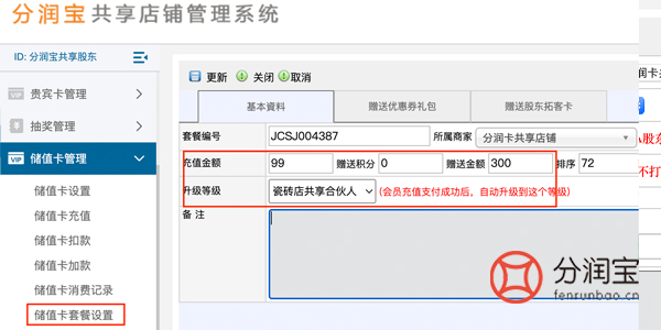 然后设置充值套餐,找到储值卡管理>储值卡套餐设置>添加>填写“充值金额”>填写“赠送金额”>选择“升级等级”>更新。顾客通过手机端充值99元,即可赠送300元,相当于储值卡里有399的余额。可以直接在商城消费,而且成为了瓷砖店共享合伙人,后期还能享受更多的合伙人优惠权益。