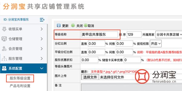 最先进入共享店铺系统后台, 把股东等级设置好,股东等级可以设置多个。找到系统配置>股东等级设置>添加>填写“等级名称”>更新