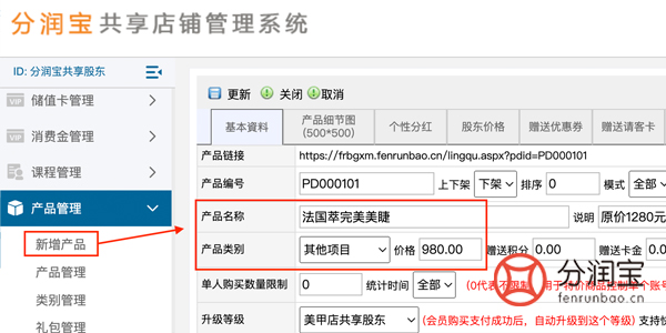 然后上架产品,找到产品管理>新增产品>填写“产品名称”>选择“产品类别”>填写“价格”>选择“升级等级”>更新