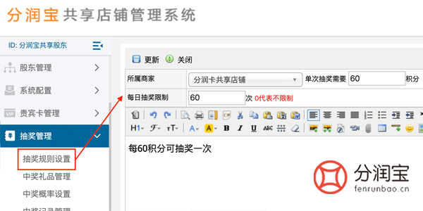 登录共享店铺系统后台,找到抽奖管理,填写“单次抽奖积分”,填写“每日抽奖限制次数”,填写“抽奖说明”,更新