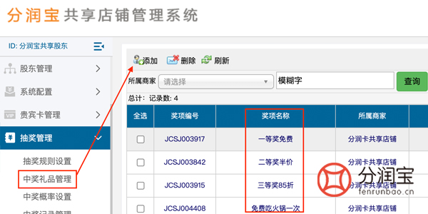 然后添加中奖礼品,找到抽奖管理,中奖礼品管理,添加,填写“奖项名称”,保存