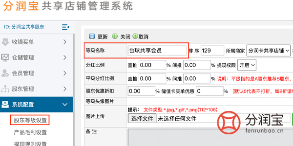在共享店铺系统后台设置股东等级,系统配置>股东等级>添加,填写“等级名称”,更新。