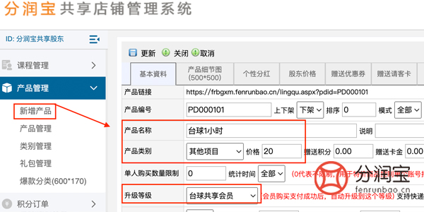 上架产品,也就是台球每小时/元购买链接的设置。产品管理>新增产品,填写“产品名称”,选择"产品类别",填写“价格”,选择“升级等级”,更新。