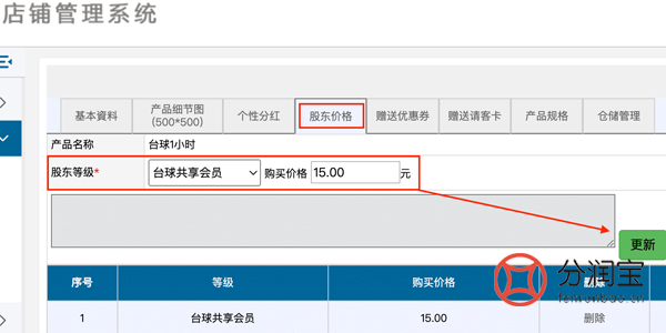 设置股东购买价格,普通会员按原价20元购买,共享会员享受股东价格15元。产品资料录入页面内找到“股东价格”,选择“股东等级”,填写“购买价格”,添加。