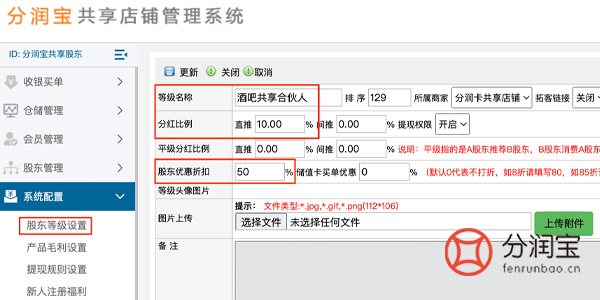 那如何通过共享店铺模式实现合伙人的招募呢?只需要在共享店铺系统后台,简单设置即可。找到系统配置>股东等级设置,填写“等级名称”(酒吧共享合伙人),填写“分红比例”(分享链接或二维码注册购买成功,推荐人可得10%分红收益),填写“股东优惠折扣”(成为股东合伙人之后,享受消费5折优惠),更新。