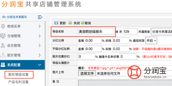 那这些活动怎么通过共享店铺系统来实现呢?设置股东等级,也就是顾客购买套餐商品链接,可以直接升级共享会员。在系统配置>股东等级设置内添加,可以按图中路径填写。