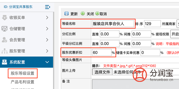 在系统配置中找到股东等级设置,添加,填写“等级名称”-服装店合伙人,填写“股东优惠折扣”-60%(也就是享受6折优惠),更新。