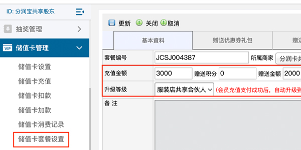 在储值卡管理中设置储值套餐,填写“充值金额”-3000,填写“赠送金额”-2000,选择“升级等级”-服装店共享合伙人,更新。顾客在手机端充值3000元,即可享受共享合伙人权益。