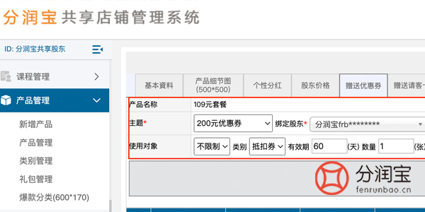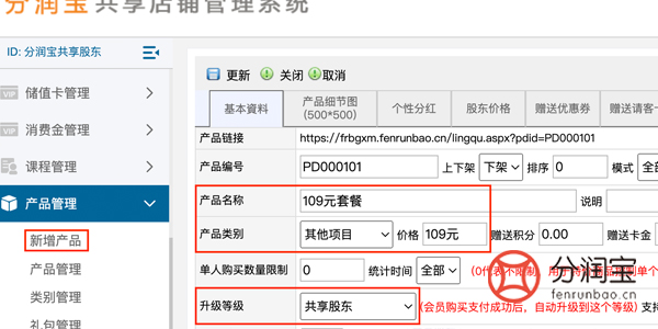 在后台上架产品,满多少赠送优惠券就能逐个设置,顾客购买成功就直接赠送优惠券了。产品管理,新增产品,填写“产品名称”,选择“产品类别”(在类别管理中添加),选择“升级等级”(在系统配置,股东等级中添加),更新。