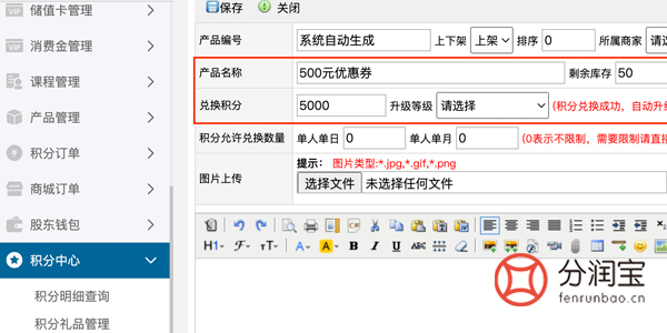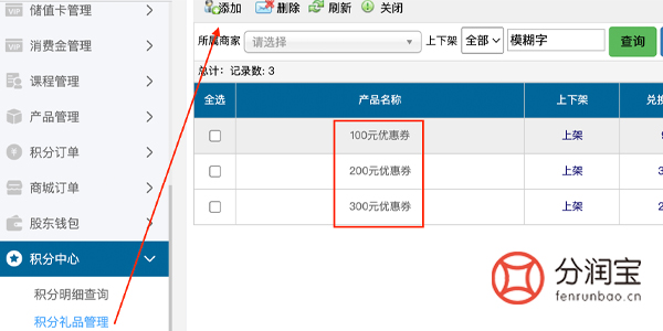 登入共享店铺系统后台,积分中心,积分礼品管理,添加,填写“产品名称”,填写“剩余库存”,填写“兑换积分”,更新。家长通过各种方式获得积分之后,可以在手机端直接在积分商城兑换商品了。