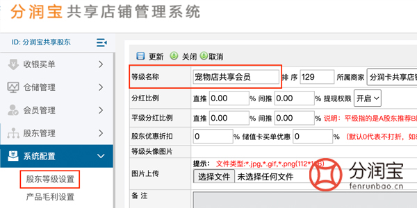在共享店铺系统后台,点击系统配置,股东等级设置,添加,填写“等级名称”,更新。顾客在手机端购买宠物洗护卡,就可以成为共享会员了,后期可以享受更多的活动福利。